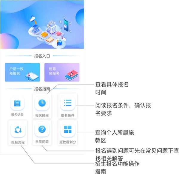 1、从户证一致入口进入【入学报名须知页面】,阅读须知后勾选底部选项,点击“城区报名”;